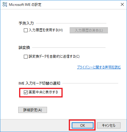 ・「Microsoft IMEの設定」ウィンドウが表示されるので、「IME 入力モード切替の通知」にある「画面中央に表示する」のチェックを外して、「OK」ボタンをクリック。